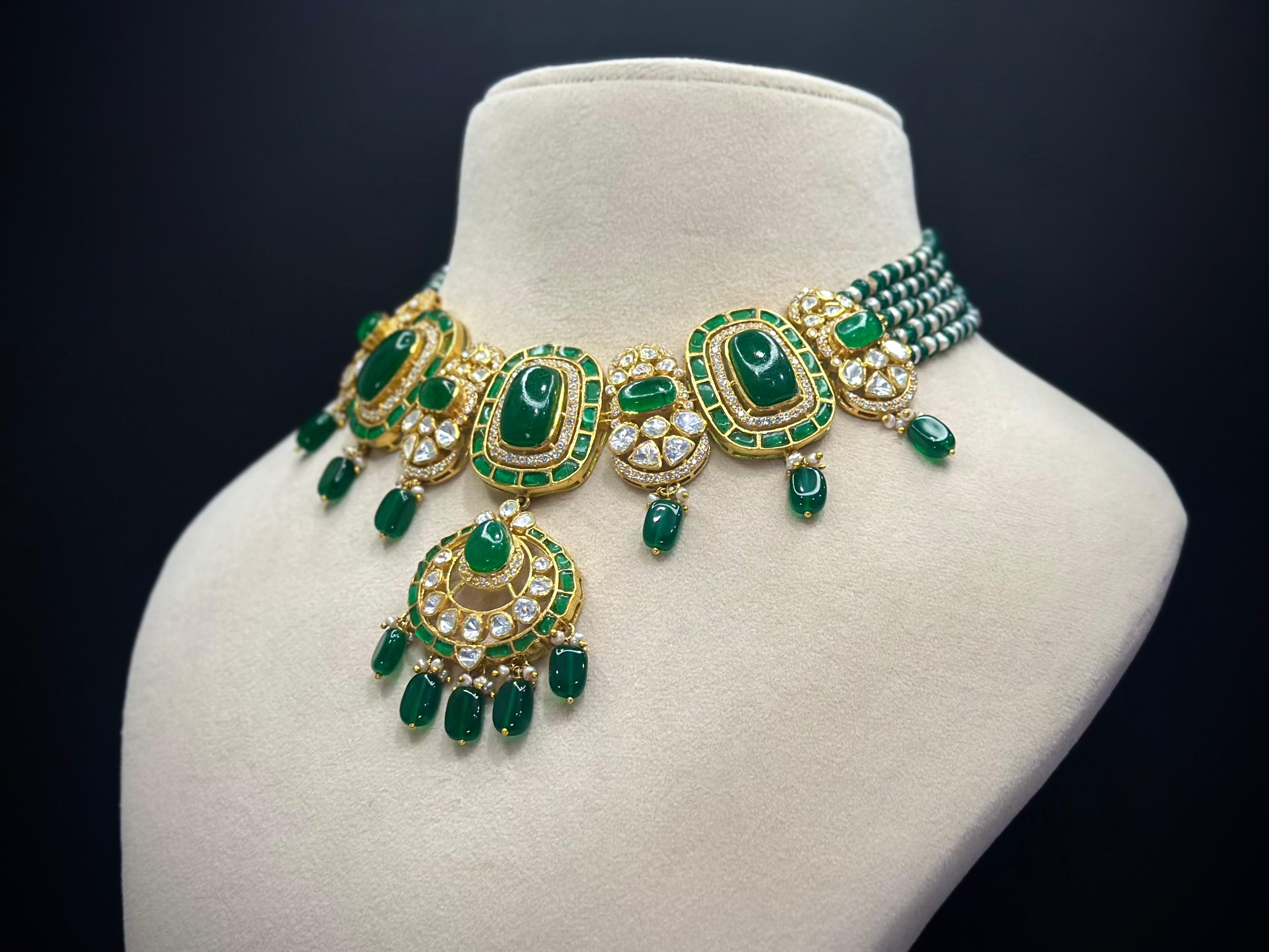The 925 Silver Green Stone Open Setting Traditional Necklace Set is a beautifully crafted piece that combines classic Indian jewelry aesthetics with elegant gemstone accents and refined craftsmanship. Handcrafted in 925 sterling silver and finished with 24K gold plating, this necklace set showcases detailed artistry inspired by traditional royal jewelry designs.