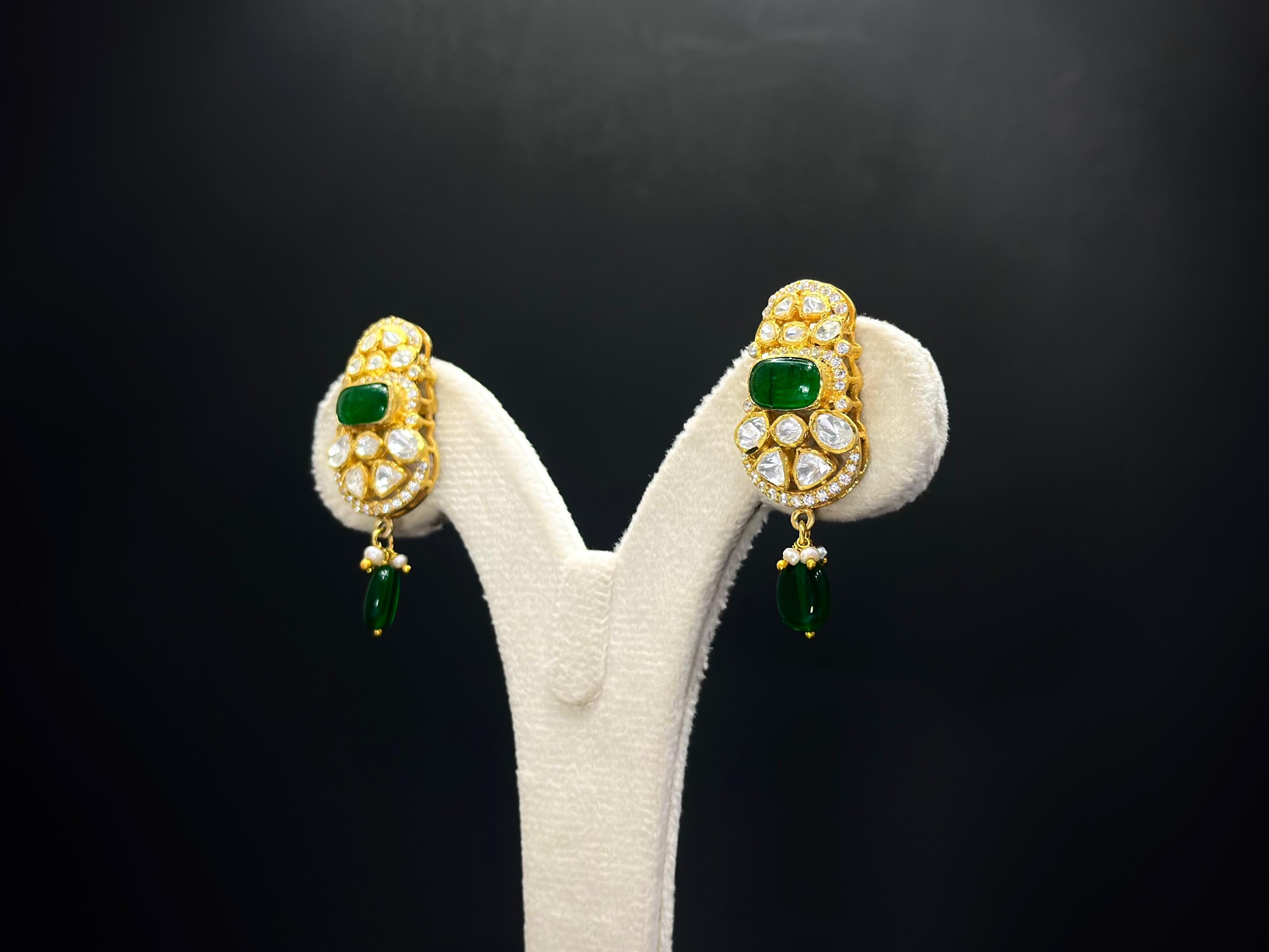 Adding movement and elegance to the design are green drop stones delicately hanging from the lower edges of the pendant and side motifs. These drops provide graceful motion while reinforcing the vibrant green theme of the piece.