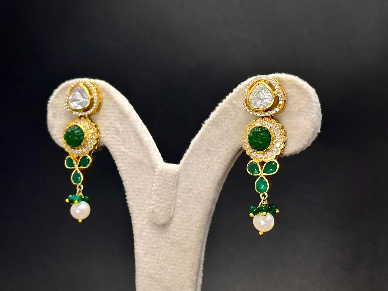 Adorned with white moissanite polki, green engraved stones, and freshwater pearls