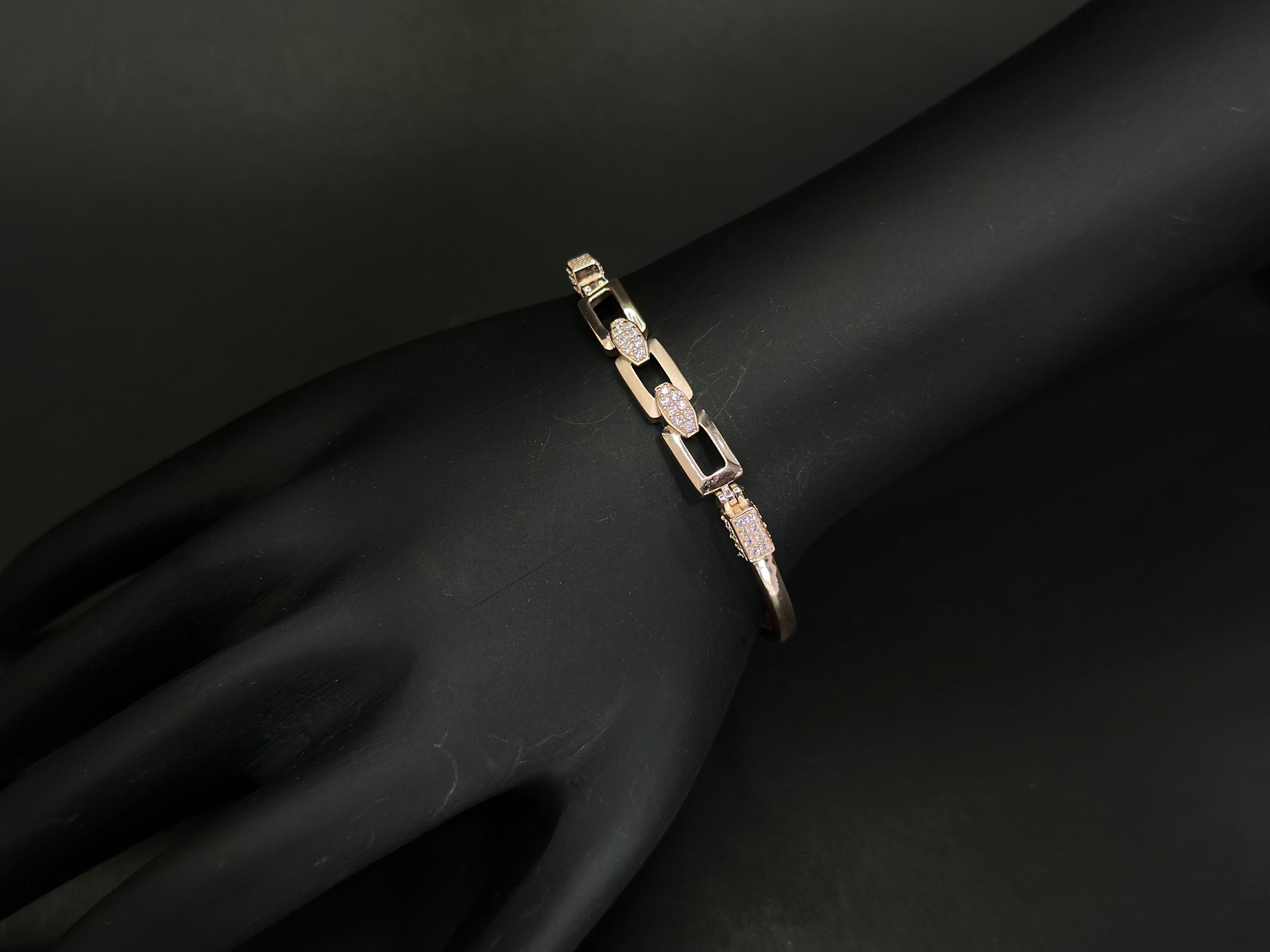 The open rectangular shapes create a contemporary architectural look, while the oval pavé-set AD stones introduce contrast and shimmer. This interplay between clean geometric lines and sparkling stone textures makes the bracelet stylish, balanced, and visually striking.