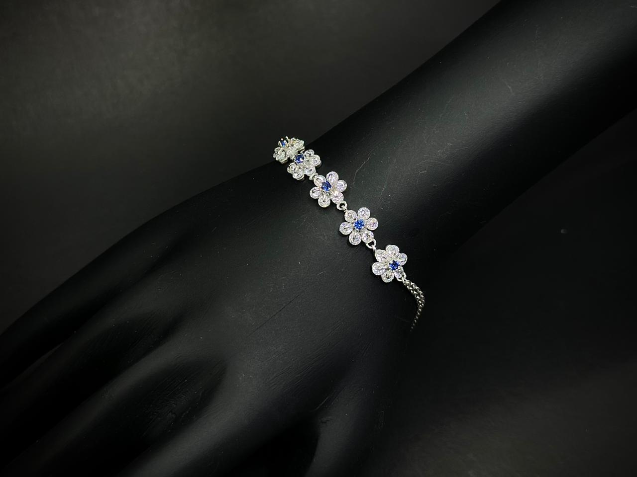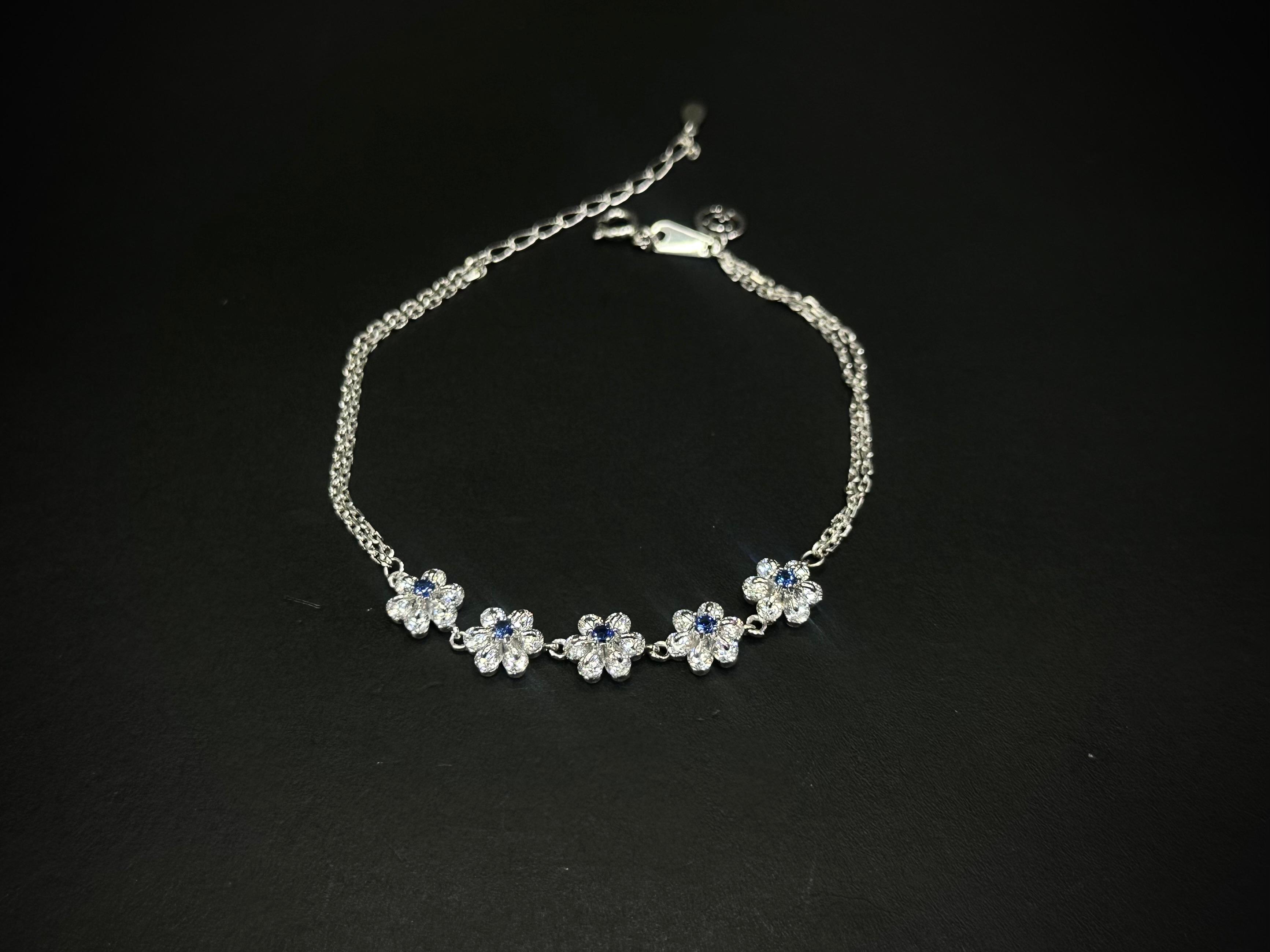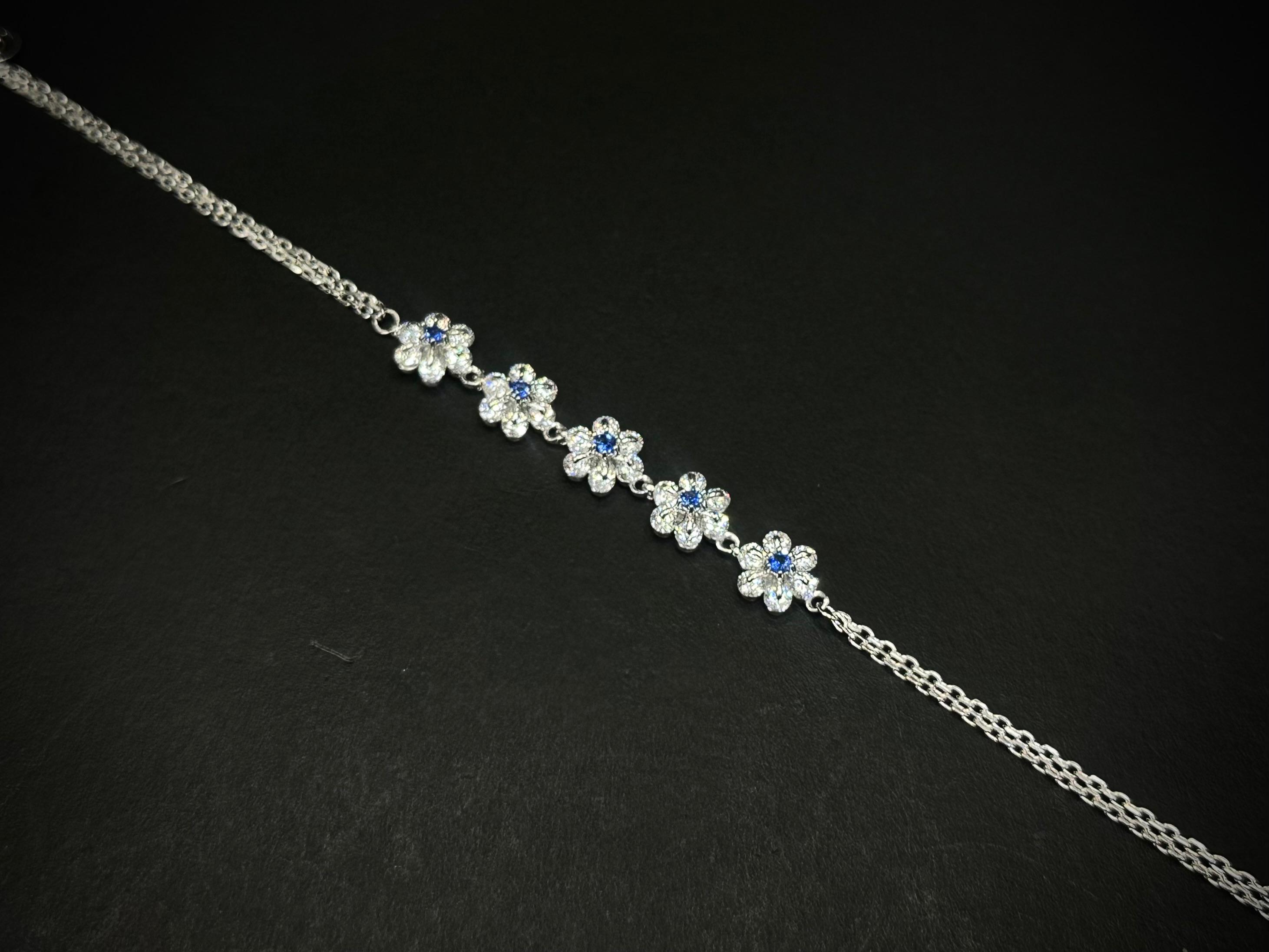 This bracelet showcases a delicate floral arrangement, where each flower motif is beautifully formed with petal-shaped white stones surrounding a vibrant blue dancing stone at the center. The central stones are designed with a dancing stone setting, allowing them to move subtly and reflect light from different angles, creating a captivating sparkle with every motion.