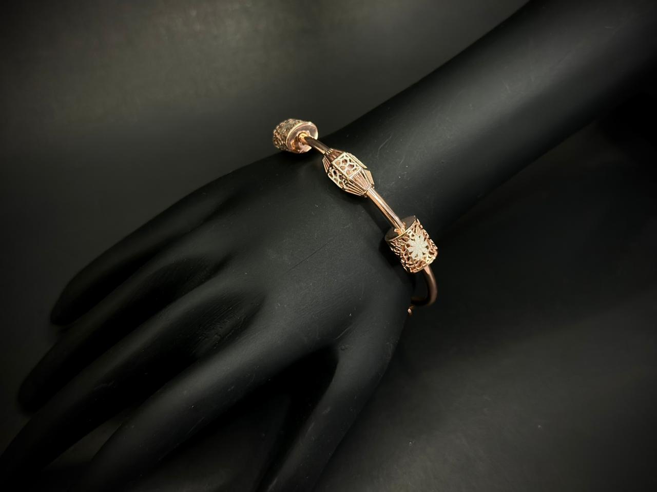 Designed with a sleek hollow-pipe curved structure, this bracelet features distinctive geometric cylindrical barrel elements enhanced with intricate Italian laser-cut floral patterns. The subtle silver-finish micro detailing adds dimension and contrast, making the design both modern and delicately feminine.