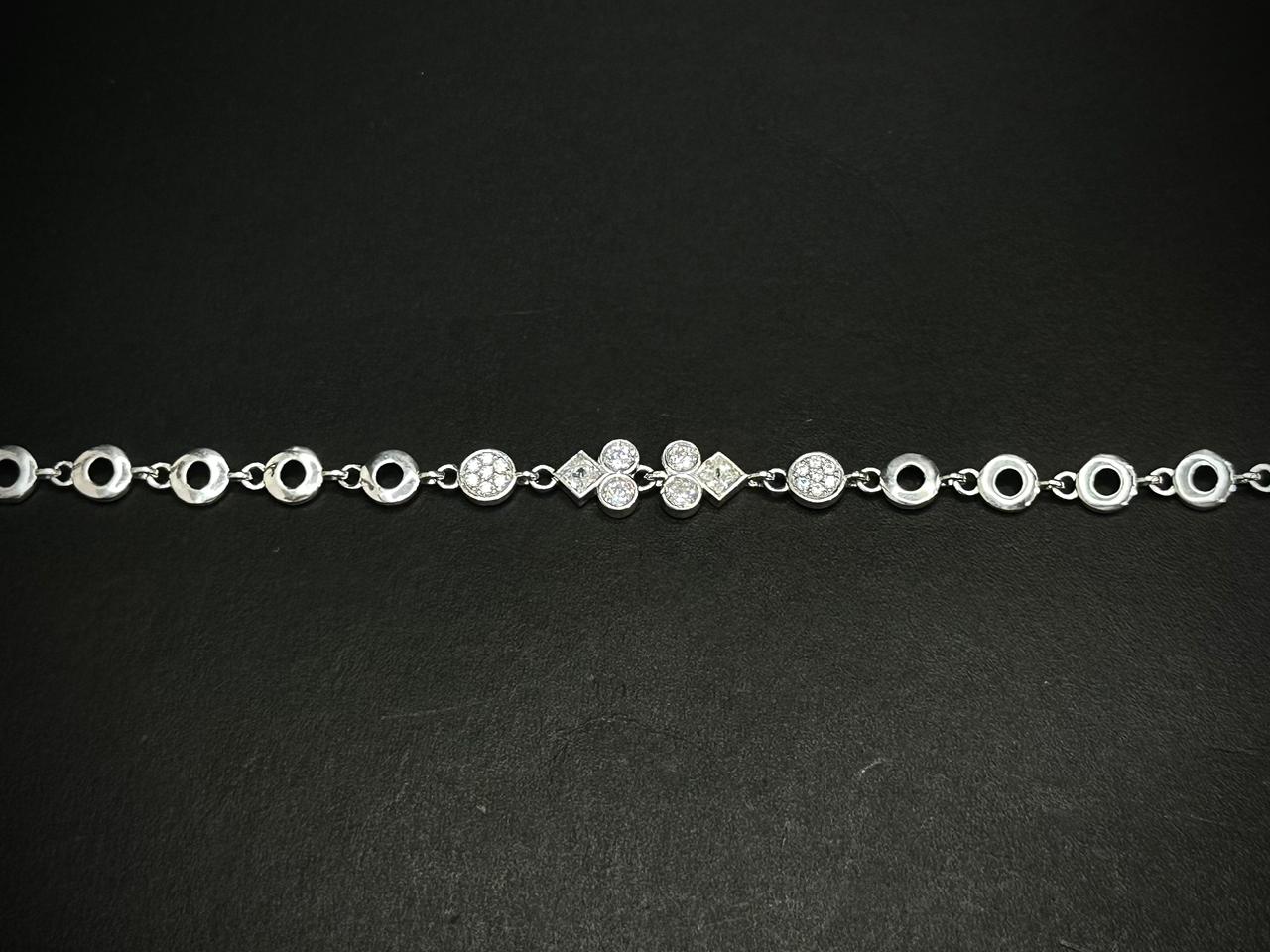 This bracelet features a graceful chain structure accented with a sequence of geometric elements including circular open rings, round pavé-set discs, and diamond-shaped connectors, all enhanced with shimmering AD stones (cubic zirconia). The balanced arrangement of shapes creates a visually rhythmic design that blends contemporary minimalism with subtle brilliance.