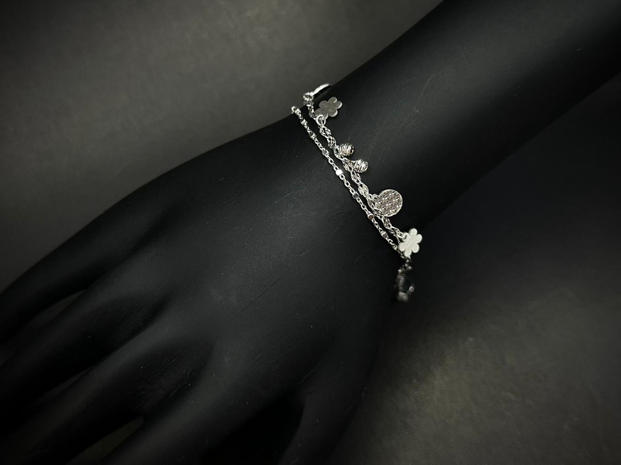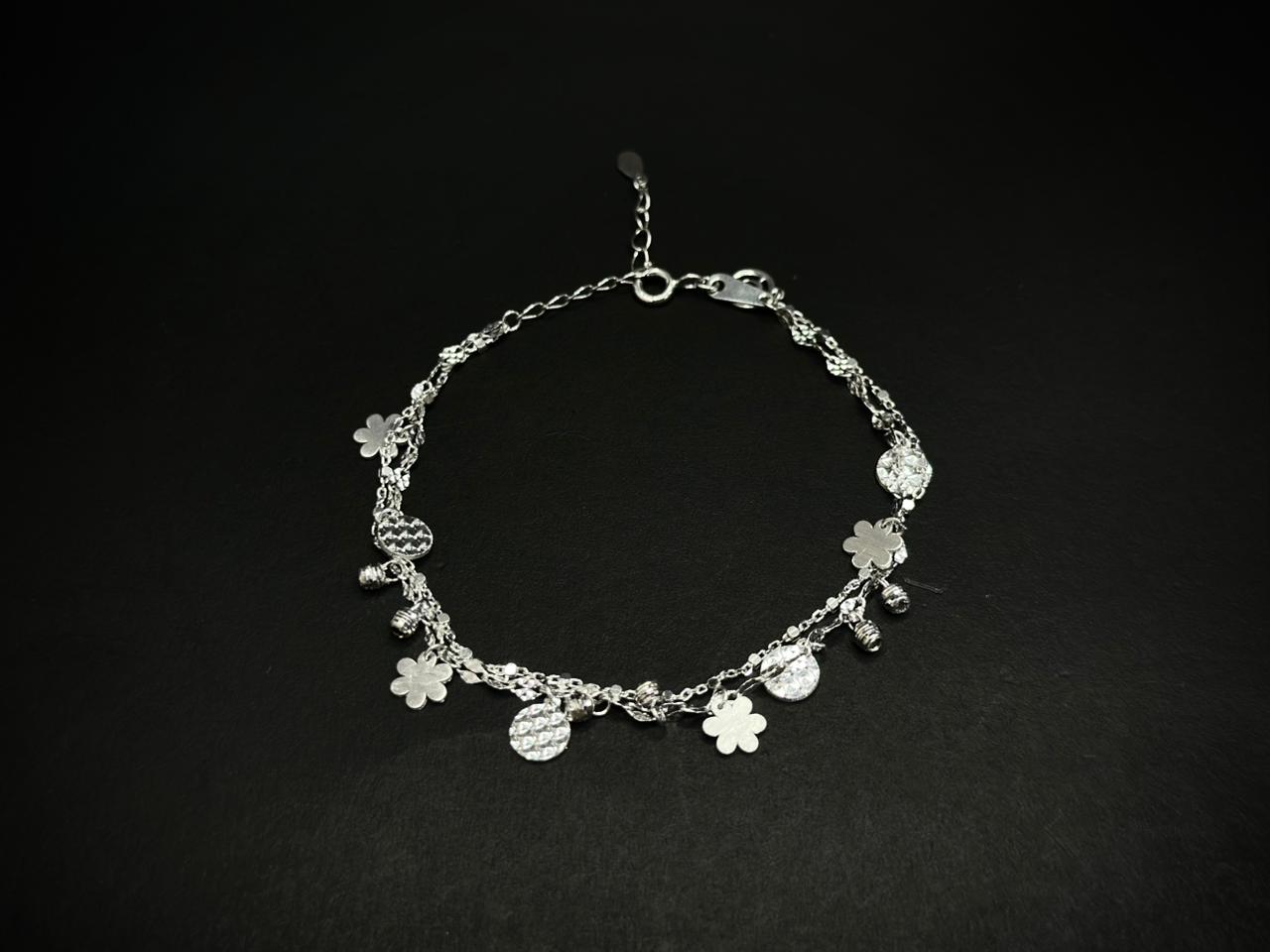 This bracelet features a beautiful dual-chain design, creating a layered and dynamic look on the wrist. Suspended along the chain are charming decorative elements including flower charms, textured circular discs, small silver beads, and sculpted shapes, each adding movement and sparkle as the bracelet gently shifts with every motion.