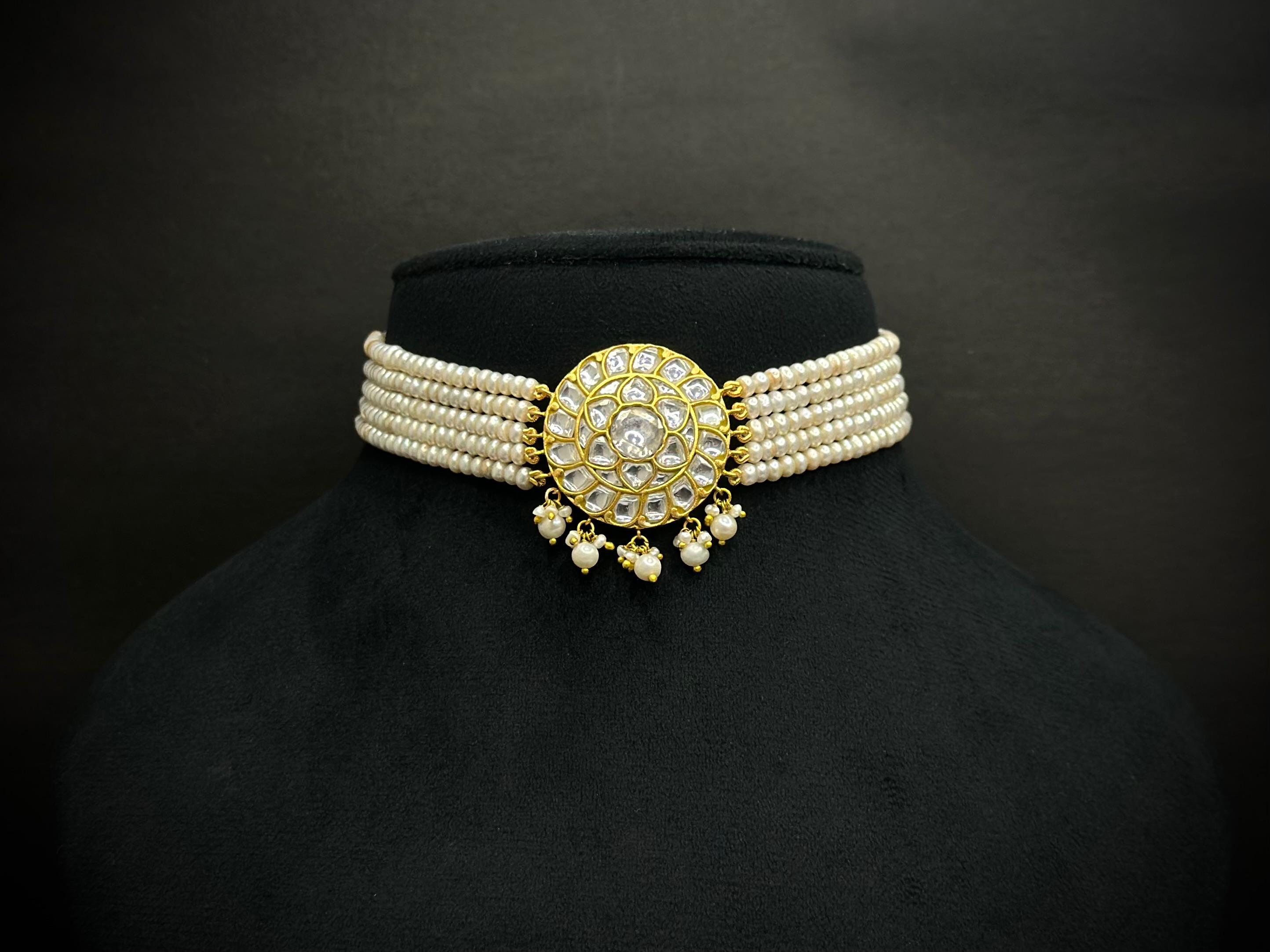 A delicate pearl and polki choker necklace set with floral motifs and handcrafted detailing, offering timeless charm and refined beauty for special celebrations.
