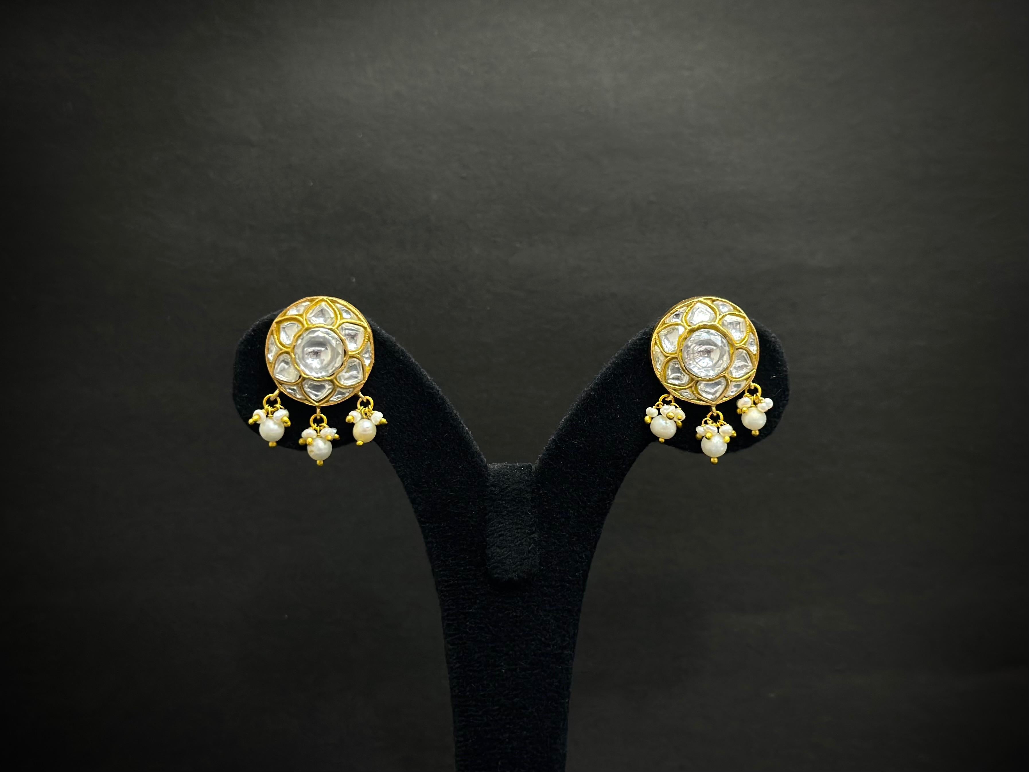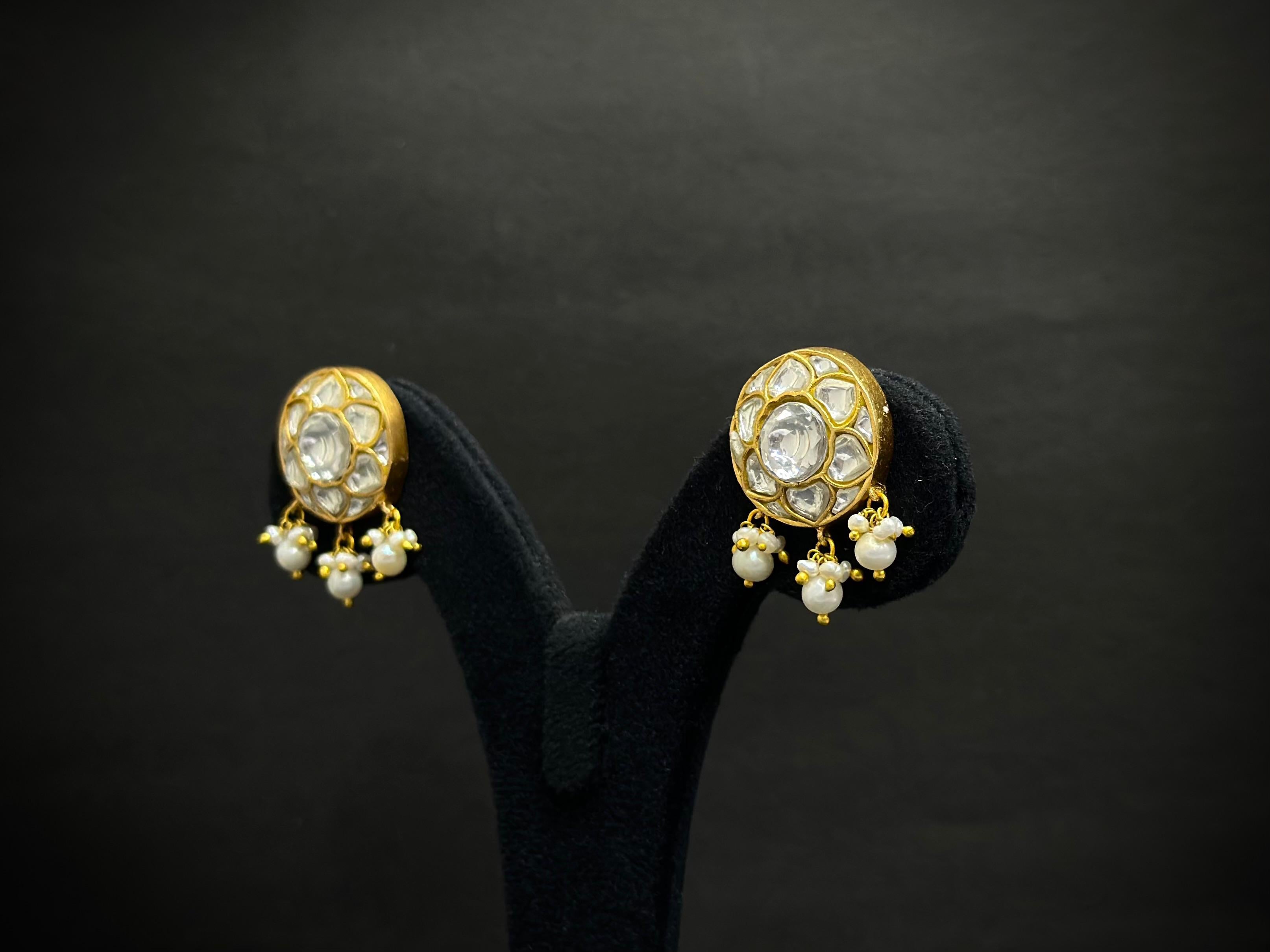 Elegant and timeless, the Floral Pearl Kundan Polki Choker Necklace Set is a refined piece inspired by classic royal jewelry aesthetics. Handcrafted in 925 sterling silver and finished with luxurious 24K gold plating, this set beautifully combines traditional polki artistry with the soft elegance of pearls.