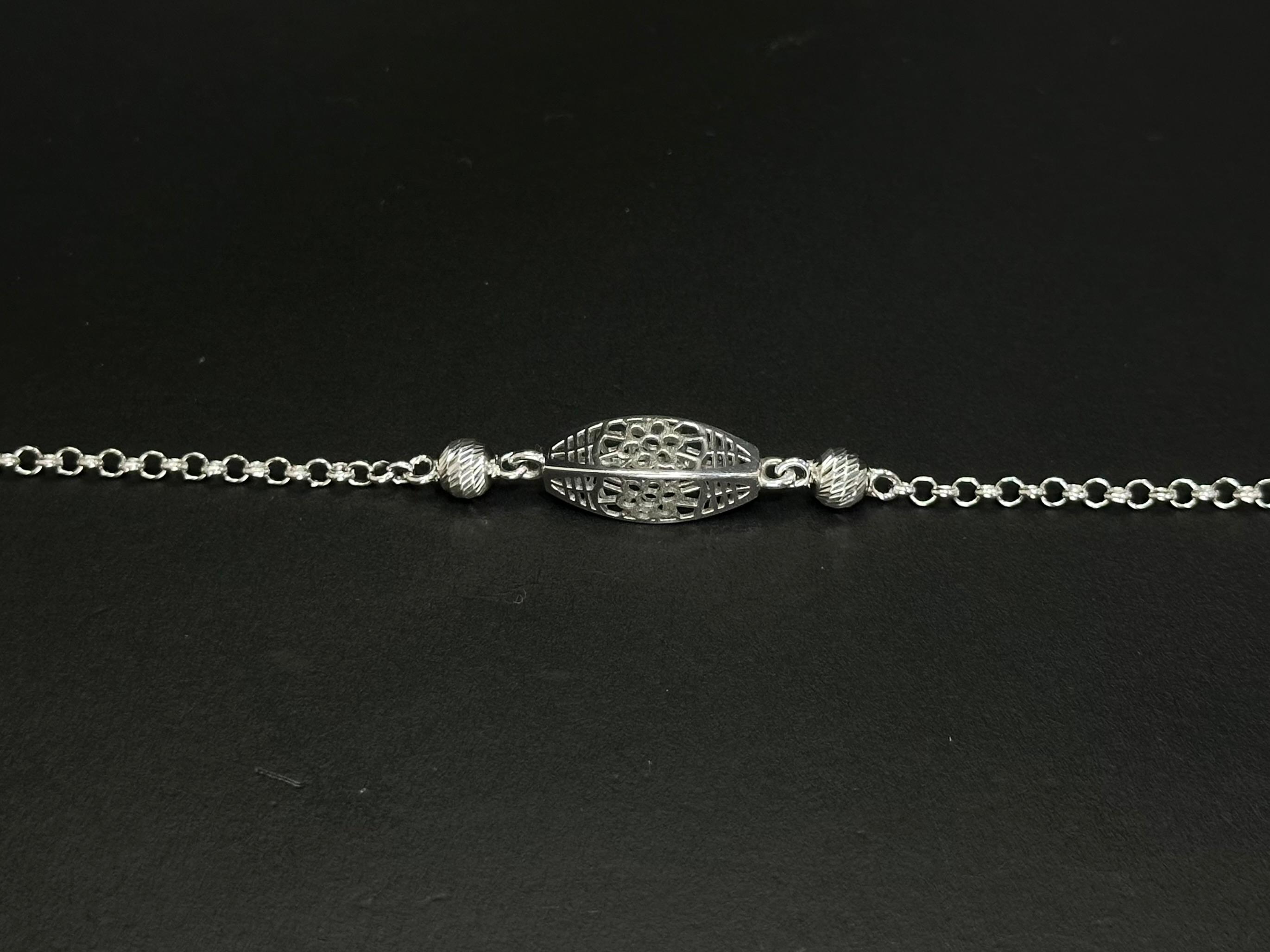The bracelet features a beautiful elongated oval centerpiece designed with an intricate laser-cut floral pattern. The openwork carving forms delicate floral motifs arranged symmetrically within the oval frame, allowing light to pass through the design and highlighting the intricate detailing of the metalwork. This refined lattice effect gives the bracelet a sophisticated vintage-inspired charm.